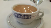 | Cafe au lait (poured the traditional way) with dessert. |